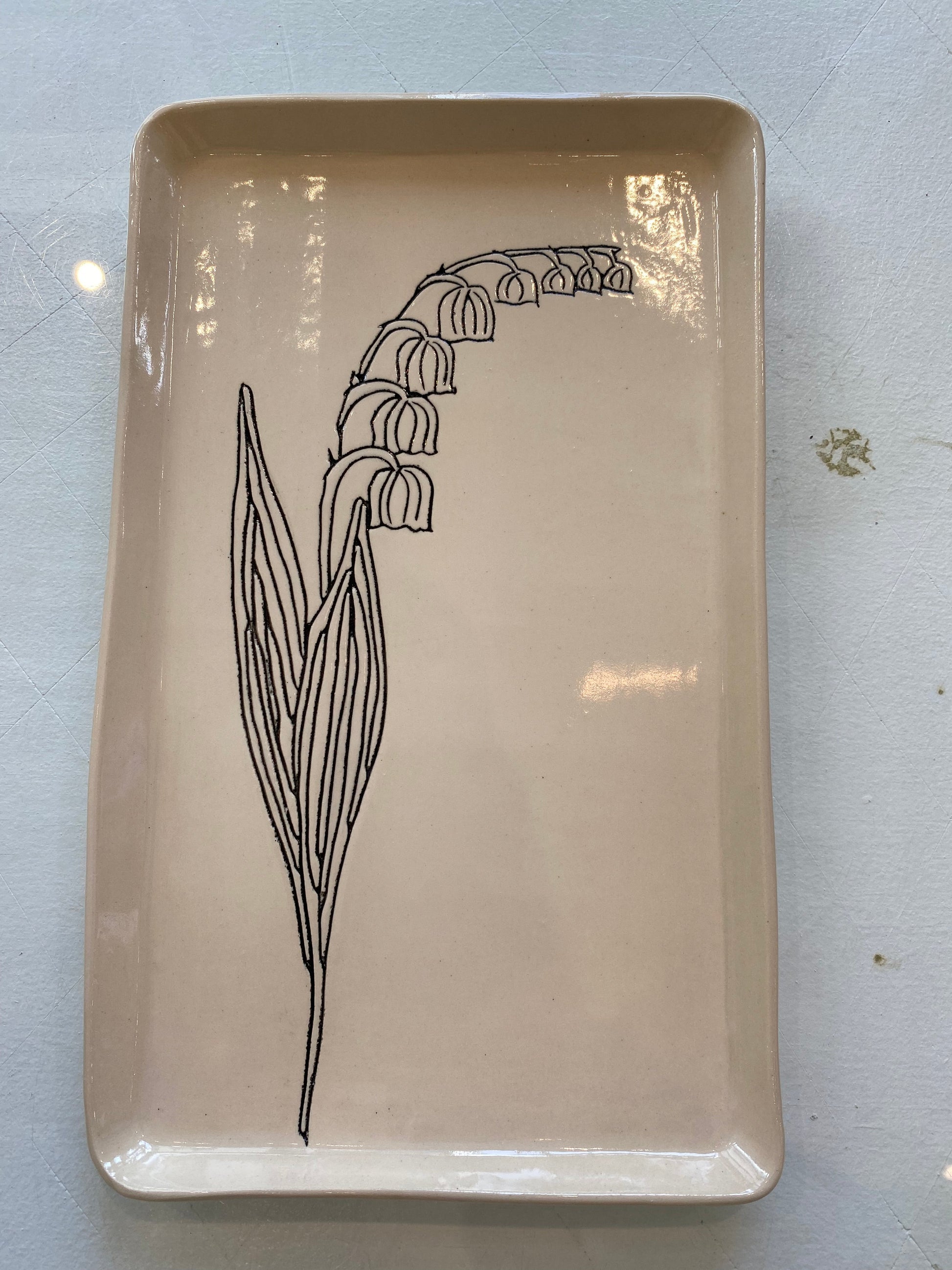 Lily of the Valley for the return of happiness and joyfulness. An early spring bloomer, it’s gentle and diminutive nature also represents sweetness. Hand etched with black inlay. Measures: 7" x 11".