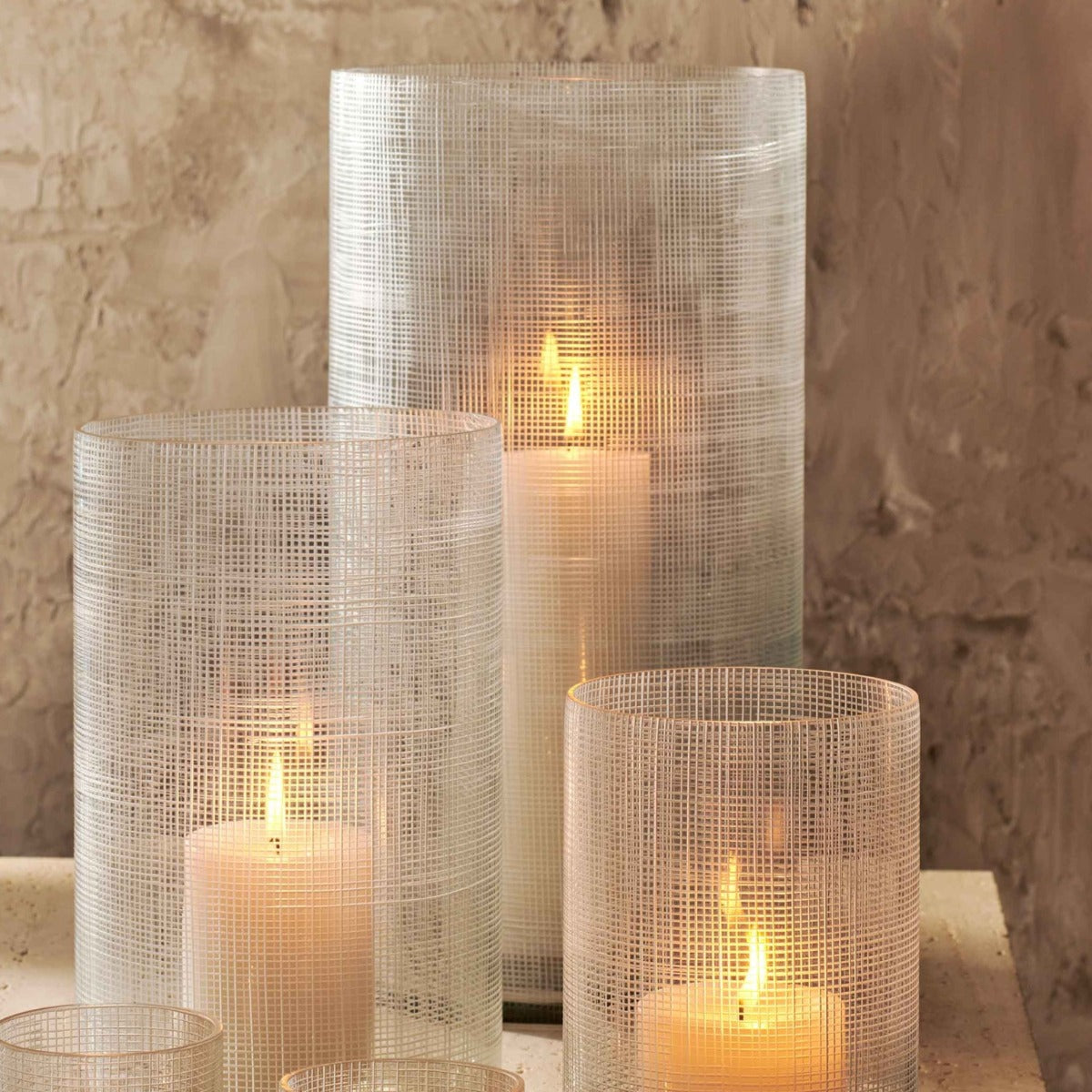 Delicate Design: The intricate pattern etched onto these clear glass cylinders may resemble loosely woven cloth, but the creative process is even more painstaking. Every line you see is meticulously cut into the glass by hand, resulting in a delicate grid that captures the warmth and beauty of candlelight.
